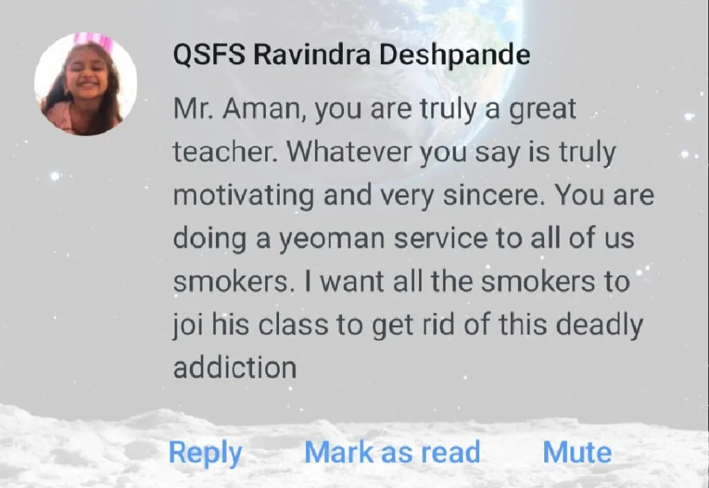 "I will recommend this QSFS or Aman sir program to all the person who really want to quit smoking or nicotine permanently, as this program is scientific based and really understandable to the person that why and how easy it will be to quit smoking and nicotine."