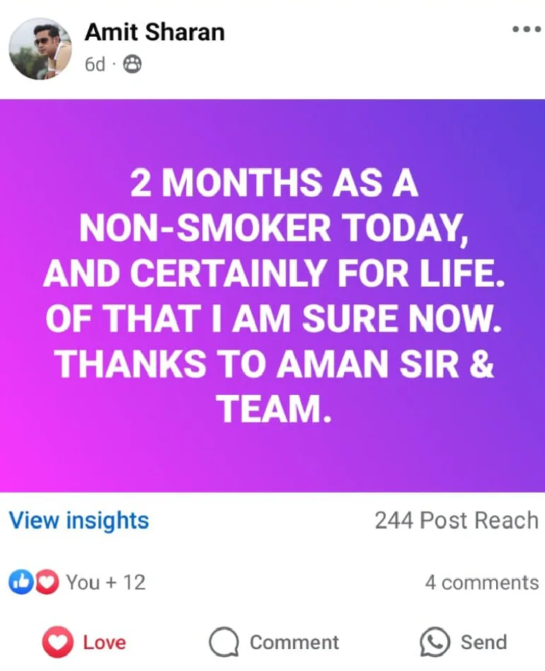 "Most scientific approach you can ever find for quitting smoking & to Remain as a NON SMOKER all the life .The best part I enjoyed was the transformative journey from SMOKER to an NON SMOKER and will be enjoying all the life the benefit & Feel of AN NON SMOKER IDENTITY . Thank you AMAN 'sir for transforming Soo many lives."