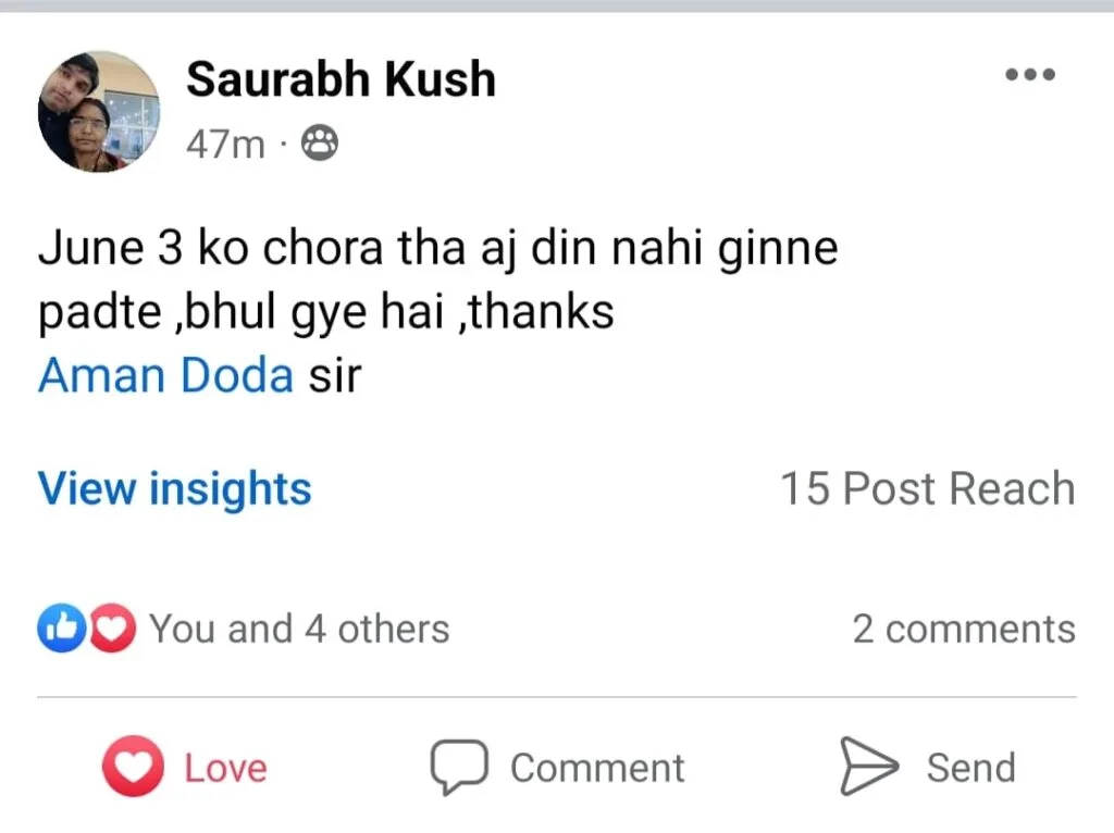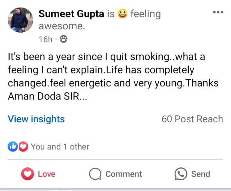 “I am very thankful to Aman Doda sir for his support and guidance and training. Now I can even accompany people smoking without any urge to smoke.”