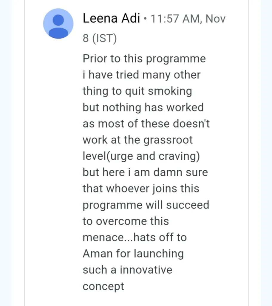 "I would definitely suggest to join this program of quitting smoking, initially you will not realise the power of this course but just do whatever Mr. Aman doda says. Sincerely. And you will definitely quit smoking.just follow all the instruction's told in course."